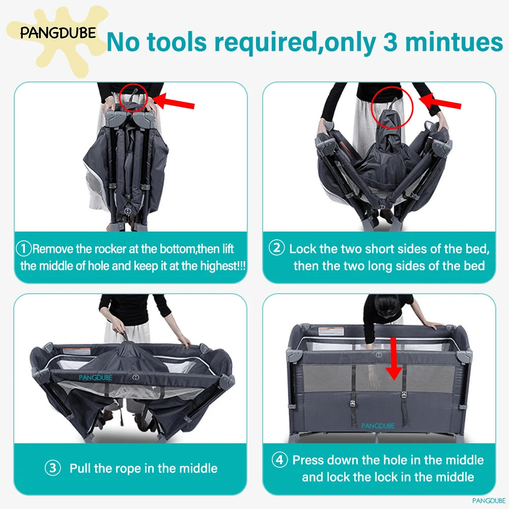 The PANGDUBE 4-in-1 Convertible Baby Crib is a versatile, space-saving solution designed to grow with your child from newborn to toddler years. This multifunctional crib seamlessly transforms between four essential modes: a secure sleeping crib, gentle rocker, convenient changing table, and safe playpen.